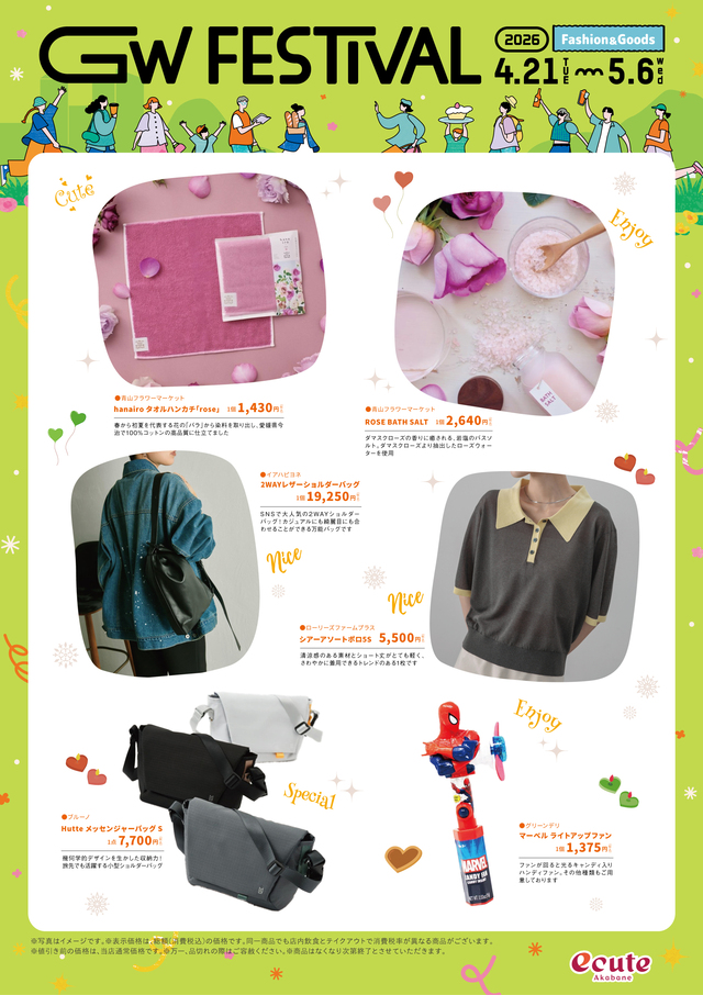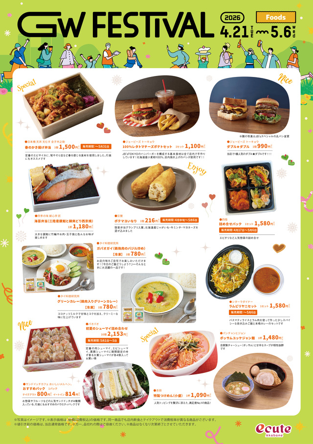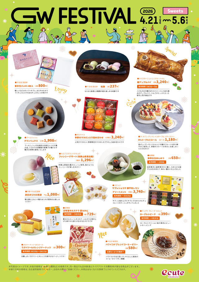 エキュート赤羽ではお出かけにぴったりのアイテムやお弁当、帰省土産におススメなスイーツ、こどもの日をお祝いするケーキなど、GWを楽しむ多彩な商品をご用意!