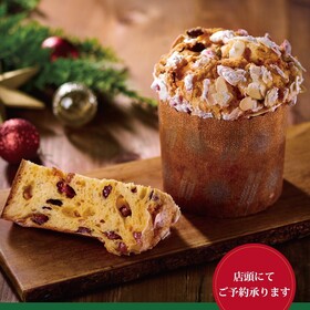 2種類のラム酒漬けレーズンとオレンジピールを入れて焼き上げ、仕上げにマカロン生地をトッピングしたイタリアのクリスマス定番菓子です。『パネトーネ 税込み2160円』