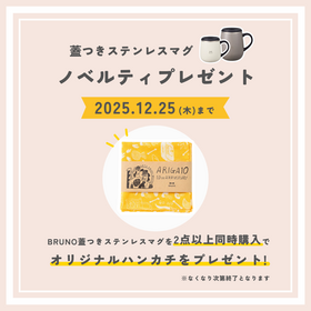 大人気の蓋つきステンレスマグを2点以上同時購入で、オリジナルハンカチをプレゼント致します。 直営店舗限定のスペシャルキャンペーンとなりますので、この機会に是非ご利用ください。 ================= 【キャンペーン概要】 ■期間:2025年11月20日(木)~ 2025年12月25日(木) ■内容:BRUNO蓋つきステンレスマグを2点以上同時購入で、オリジナルハンカチをプレゼント。 ステンレスマグのサイズ、カラーはお好みの組み合わせでお買い求めいただけます。 ※ キャラクターデザインの商品はキャンペーン対象外となります。 ※ 本キャンペーンは、予告なく変更または終了する場合がございますので、あらかじめご了承ください。 ※ 他のキャンペーンとは併用できない場合がございます。 ※ ノベルティは商品ご購入時にレジにてお渡しします。後日渡し・お取り置き・再発行はできません。