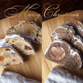 スパイスと洋酒の芳醇な香りとナッツの食感、レーズンやオレンジピールの味わいがひろがるルビアンオリジナルのシュトーレンです。『シュトーレン 税込み3456円』『シュトーレンS 税込み2160円』