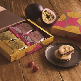 福島県の米粉を使用したサクっとした軽い食感のクッキーに、トロっとした食感のパッションフルーツとラズベリーのフルーツキャラメルソースをミルクチョコレートでコーティングしサンドしたキャラメルサンドです。