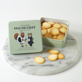 メイドさんと執事のコスチュームを身に纏っためんどり母さんと子猫ちゃんの姿が描かれた、シックでキュートな1品です。起泡性の高い卵白がかなえるサクッとした軽快な食感と、お口でほろりとくずれる繊細なくちどけが特徴です。