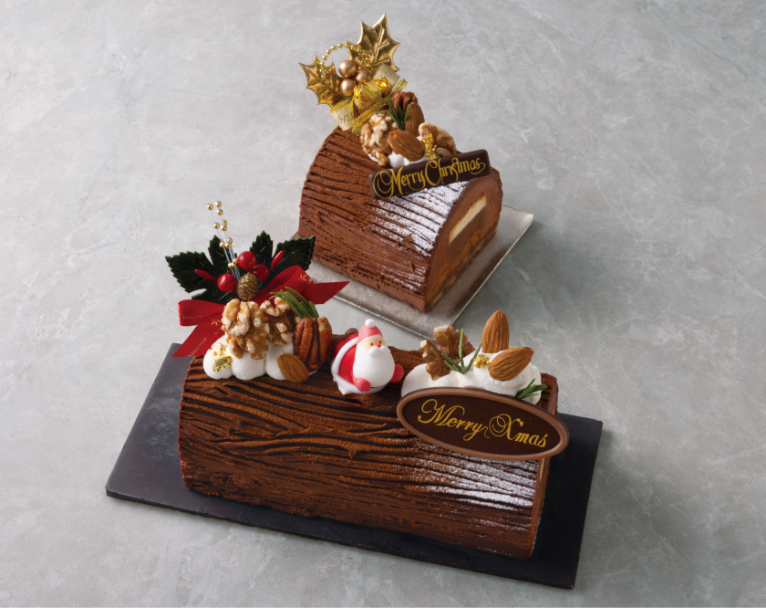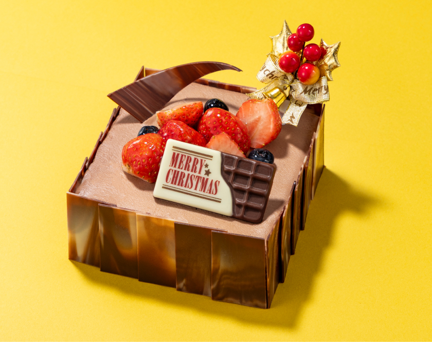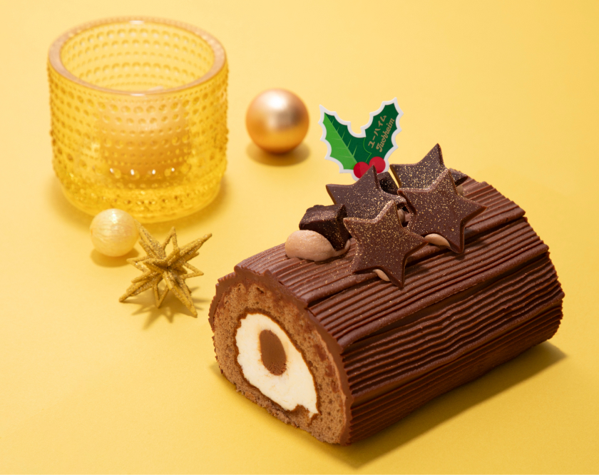 限定生クリームとチョコガナッシュクリームをココアスポンジで包み、天面に絞りガナッシュ、星チョコレートとトリュフ風チョコをトッピングした2人用サイズのロールケーキ。