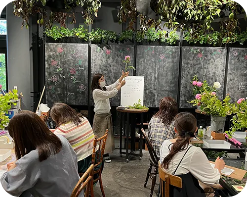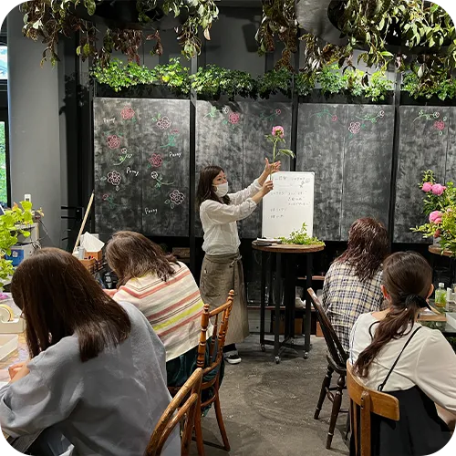 環境負荷低減に取り組む認証を取得した生産者が育てた花と、リサイクルパルプや天然ゴムを材料に生産されたサステナブルな新素材の花器を使用したアレンジメント作りです。親子で楽しめるワークショップです。