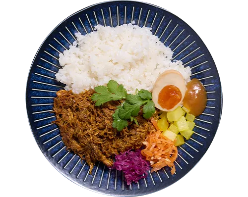 卵明舎の親鶏、堀内果実園の規格外の柿、猿田彦珈琲のコーヒーといった素材がスパイスのちからで、居酒屋メニューで人気の美味しいパキスタンカレーに生まれ変わりました。一見すると普通のおいしいカレーですが、実はサステナブルな素材をたくさん使っているという、まさに「おいしいめぐみ」な一皿です。