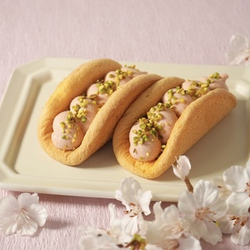 粉をほとんど使わず、卵のやさしい風味を生かして焼き上げたふんわり軽やかな特製オムレット生地。 中には、特製桜ペーストを加えたほんのり塩味のあるムースリーヌをたっぷり絞りました! やさしい甘さの中に感じる塩味が桜の香りを引き立て、仕上げにまぶしたピスタチオが香ばしいアクセントに♪ 【桜のオムレット】400円
