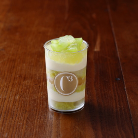 ふんわりしたティラミスクリームに、シャインマスカットのポンシュをしみ込ませたビスキュイ、さっぱりしたレモンゼリーと合わせた、夏