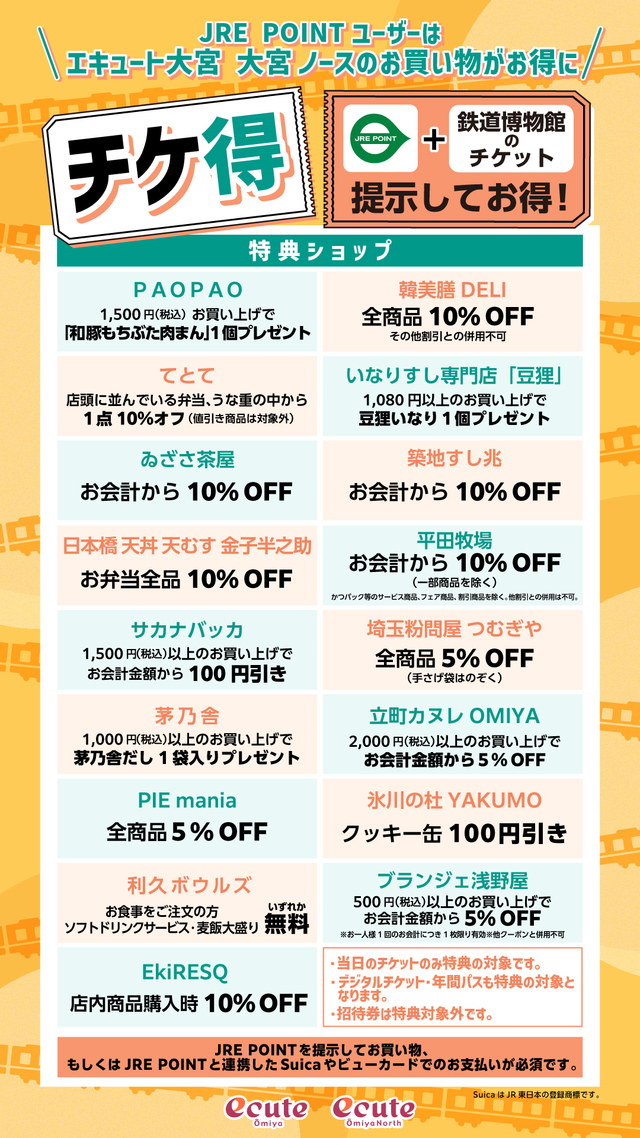 鉄道博物館をご利用の方に、エキュート大宮で使えるお得なサービスをご用意しております。