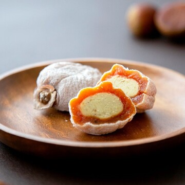 この時期おすすめの「栗福柿」は長野県市田産の干し柿の中に、氷砂糖で丁寧に炊き上げた良平堂特製の栗きんとんを詰めた贅沢な和菓子です。干し柿の自然な甘みと、栗きんとんのまろやかで奥深い味わいが絶妙に調和し、ひと口ごとに心和む上品な味わいをお楽しみいただけます。