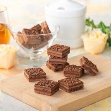 高級感のある金色のパッケージに、はじけるザクザク食感。ビスケット生地にココアパウダーをまぶした「ショコラビスキュイ」、細かくクランチした生地にホワイトクリームを練り合わせた「ブリスショコラ」。