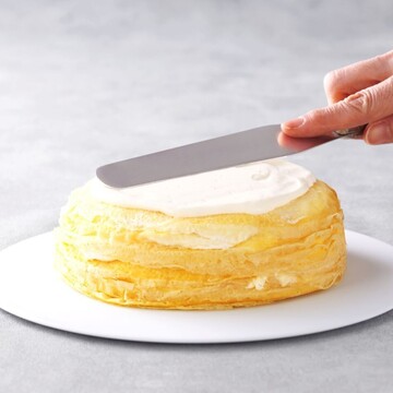 カサネオのシェフが1988年に発明した、「ミルクレープ」。向こうが透けるほど薄いクレープを重ねて完成させる、真似できない口どけが魅力です。