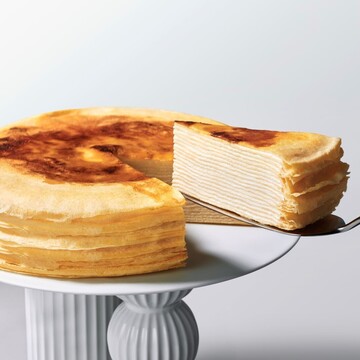 カサネオのシェフが1988年に発明した、「ミルクレープ」。向こうが透けるほど薄いクレープを重ねて完成させる、真似できない口どけが魅力です。