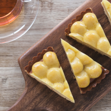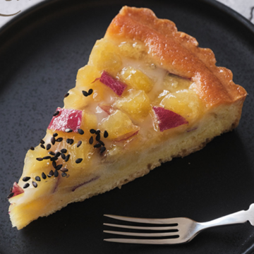 アーモンドをたっぷりと練りこんだクレームダマンドを敷き込み、 オーブンでじっくりと焼き上げました。