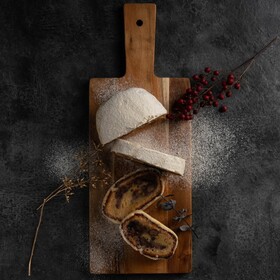 発酵バターを贅沢に使った風味豊かな生地で、北海道産小豆入りのアーモンドクリームと、糀甘酒と洋酒に漬け込んだ伊予柑ピールや大納言・金時豆・栗の甘納豆をたっぷり包みました。優しい甘さの和三盆糖で仕上げた和のシュトーレンです。