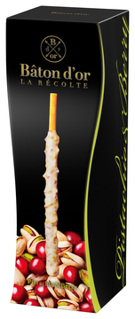 澄ましバターの濃厚な味わいと華やかな香りが特徴のプレッツェルにこだわりのチョコレートをコーティング。期間限定品として、「栗」や「ブラッドオレンジ」に加えて、“特別な想いを伝えるスペシャリテ「ラ レコルト」”より「ピスタチオ&ベリー」を展開。