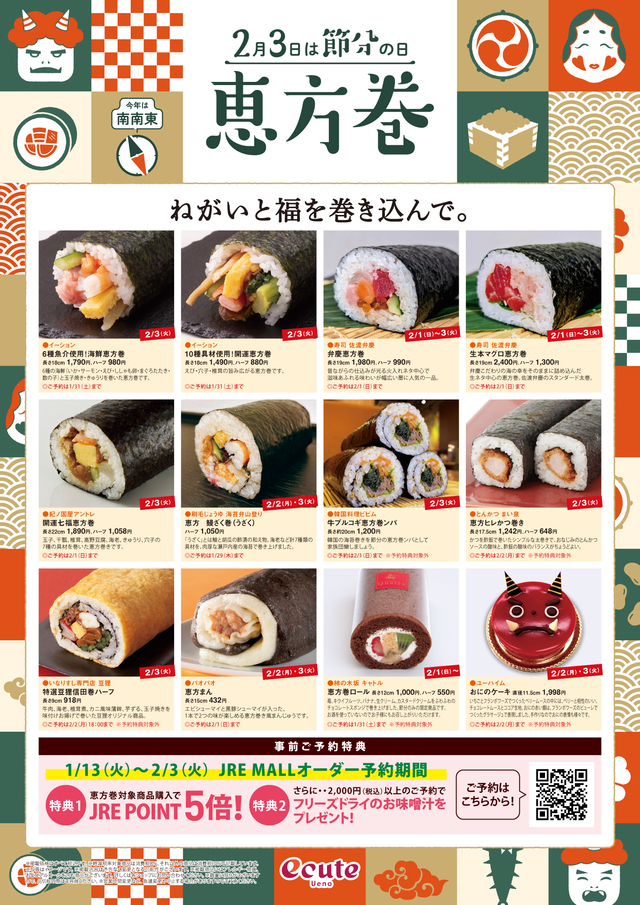 ・期間中、JRE MALLオーダーにて、恵方巻対象商品のご予約でJRE POINTが5倍!(通常ポイント)